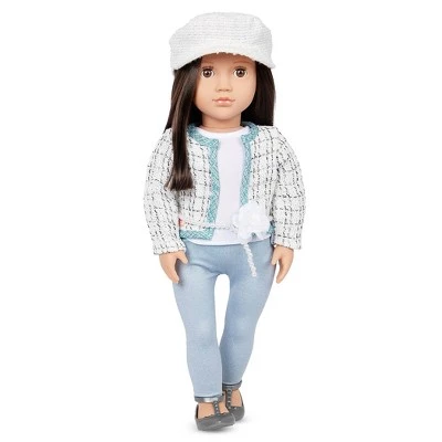 Discover cute fashion and trendy styles with Lysie! This Our Generation 18-inch doll has beautiful brown eyes that open and close with below shoulder-length brown hair that’s fun to style. She is wearing a plaid tweed jacket, casual T-shirt, denim-style pants, and a cute pearl waist belt with a decorative flower for a touch of floral fun. Add braids, twists, or ponytails to Lysie’s hairstyle and accessorize with the matching hat – she loves to stay stylish from head to toe! Lysie has a huggable soft body and can rotate her neck, arms, and legs to easily change outfits, so you can explore more fun looks together during every adventure! (Additional outfits sold separately)