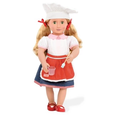 A sprinkle of sugar and a dollop of dreams are the perfect ingredients for hours of pretend baking fun with the Our Generation Master Baker Set, a baking accessory set for 18-inch dolls! Whether you’re practicing to be the next master chef or just making some sweet treats to share with your friends and family, this kitchen accessory set for dolls has everything you need. Dress your dolls in the adorable chef’s hat and apron to protect their outfits. Measure out your ingredients with the scale, measuring cups and spoons, scrape them into the stand mixer with the spatula, and turn it on – there are three mixer speed settings, so your baking will turn out just right! This set comes with all kinds of kitchen tools and sweet baked treats that are perfect for a picnic or a tea party. The only limit to what you can cook up with this doll baking set is your imagination! The dolls pictured are Noa and Jenny. (Dolls and outfits sold separately, available at Target. Compatible with American Girl dolls.)