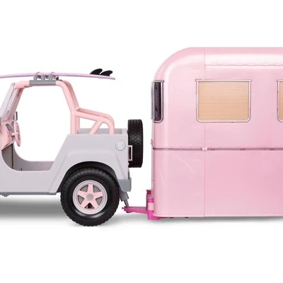 Take the sweetest trips with your 18-inch dolls in the Our Generation Off Roader 4×4! This durable and stylish vehicle has a built-in Bluetooth speaker, so your dolls can listen to their favorite tunes during their trips! Turn the steering wheel to activate the signal lights, make the wipers swoosh when it starts to drizzle, and switch on the headlights during nighttime cruising! The included surfboard can be mounted on the roof rack when visiting the beach on sunny days, and the trailer hitch folds down to connect the Our Generation RV Camper or the Mane Attraction Horse Trailer! Fully assembled and ready to play with, this light-gray 4×4 vehicle comfortably fits 2 Our Generation dolls with their loyal pals sitting happily in the back. Beep! Beep! Fun and adventure are just around the corner! (Dolls sold separately)